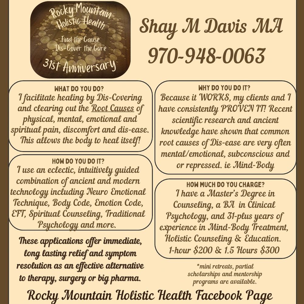 Shay M. Davis, MA is a seasoned Holistic Health Care Practitioner, Lightworker, Mystic, Empath, Minister and Mentor with over 31 years of experience in Mind-Body Healing and Holistic Health Practices Education. She holds a Master's Degree in Counseling earned at Southwestern College in Santa Fe NM and a Bachelor’s Degree in Clinical Psychology with a Minor in Science earned at Western State College in Gunnison Colorado. She is also an Ordained Minister, a Teacher Level Reiki Practitioner and was a Certified Massage Therapist for over 10 years. Shay specializes in Dis-Covering and resolving the root causes of physical, emotional, mental, and spiritual dis-ease using an eclectic and intuitively guided combination of ancient wisdom and modern technology. Her integrative approach includes modalities such as Neuro Emotional Technique, Emotion Code, Body Code, Emotional Freedom Technique, Spiritual Counseling, Mentorship and Traditional Psychology just to name a few. Shay’s intention is to facilitate True Healing, resolving myriads of symptoms for immediate and long-lasting relief and better overall health. The body’s natural ability to heal itself is at the core of her practice.